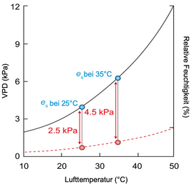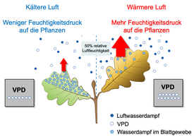 Ein hohes VPD veranlasst die Pflanzen, ihre Spaltöffnungen (Stomata; kleine Öffnungen auf den Blättern) zu schliessen, um den Wasserverlust zu verringern und Schäden an ihren Wassertransportsystemen zu vermeiden. Dadurch wird jedoch auch die Menge an Kohlendioxid (CO2) verringert, die die Pflanzen für die Photosynthese aufnehmen, was ihr Wachstum beeinträchtigt. Ausserdem verlieren Pflanzen bei einem hohen VPD schneller Wasser durch Transpiration (Wasserbewegung durch die Pflanze und Verdunstung von Blättern oder Nadeln), bis zu einem Punkt, nach dem Transpiration entweder hoch bleibt oder abnimmt, was den Wasserstress der Pflanzen weiter erhöhen kann.